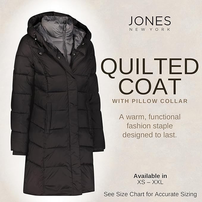 - PUFFER COAT WITH BIB & PILLOW COLLAR – A cozy bib and pillow collar top off this cozy womens puffer jacket from Jones New York. Our puffy coats for women are available in Black, Navy, Wine, and Bronze, and Sizes XXS, XS, S, M, L, XL, XXL.
